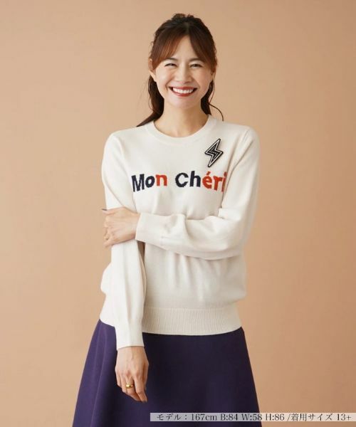 インターシャで編み上げたロゴが目を惹くニットプルオーバー。ロゴは中村江里子氏の提案からセレクトしており、フランス語の「Mon cheri(大切な人)」をアレンジしたウィットに富んだデザイン。身頃はすっきりとしたサイズ感で、浅めのクルーネックが女性らしい上品な印象を与えます。さらに付属の稲妻ブローチが遊び心のあるユニークなアクセントに。