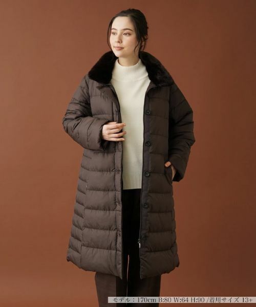 ワイドな横キルティングを施した、中わた入りのロングコート。サイドは幅を狭くしたキルティングに切り替え、緩やかに広がりをもたせたAラインシルエットでエレガントな雰囲気に。スタンドカラーで仕上げた内襟部分にはフェイクファーをあしらい、季節らしい温もりを感じさせるエッセンスをプラス。ファーは取り外しでき、2wayでの着用が可能。フロントはボタン×ファスナーのダブルクロージャー仕様でしっかり保温性もキープできます。