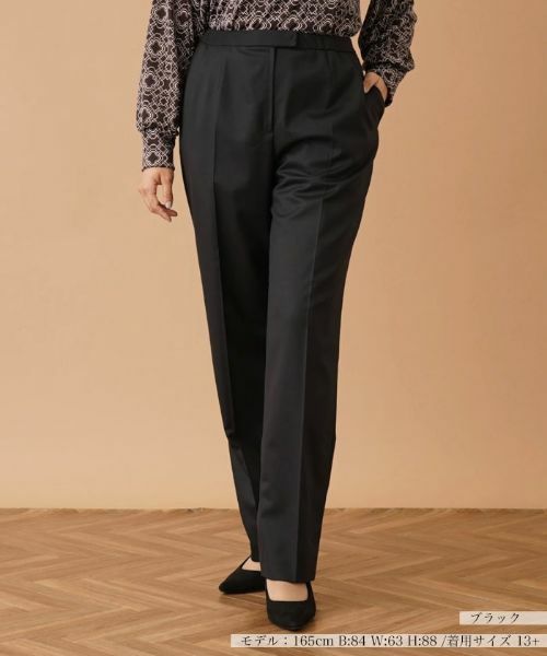 太すぎず細すぎずの絶妙なストレートシルエットを描くセンタープレスパンツ。股上をやや深めに設定することで適度なリラックス感をもたせています。無駄な装飾を省いたベーシックなデザインとなっており、様々なトップスとコーディネートしやすい一本。ウエストには程よい伸縮性があり心地よくフィットします。スナップボタン&ファスナー、ホックにより開閉が可能。