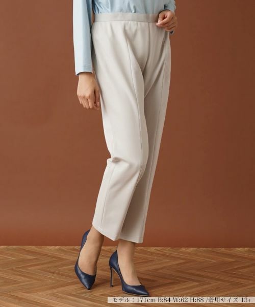 肌当たりのよいレーヨン×ナイロンをベースとした生地に、ストレッチ素材を混紡した伸縮性抜群のアンクルパンツ。レッグラインはシャープに絞り込み、すっきりとしたシルエットを描いています。ウエストゴムは総ゴム仕様で心地よいフィット感をもたせました。無駄のないベーシックなデザインでアクティブな動作にも難なく対応できるので、オンオフのシーンを選ばずに活躍してくれそうです。サイドホック&ファスナー、スナップボタンにより開閉が可能。
