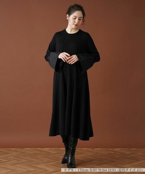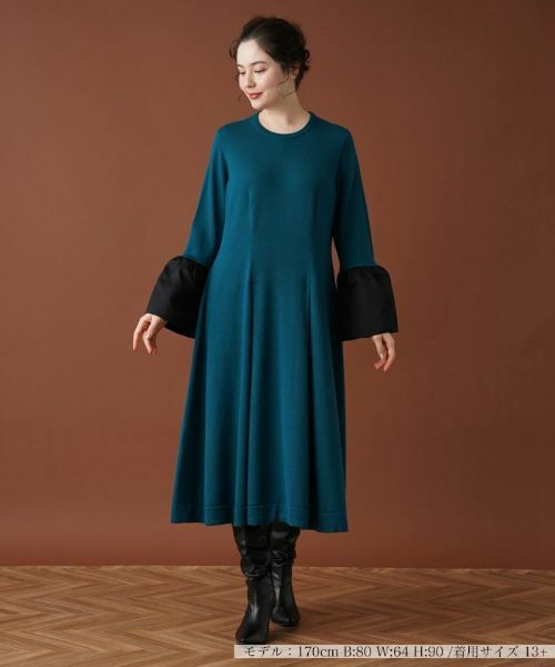 柔らかなニット素材がボディラインに優しく寄り添う、ロングレングスのフレアワンピース。スカート部分はふわりと広がりをもたせた優美なドレープシルエットが印象的。袖口は異素材のベルスリーブで切り替え、モダンレディなアクセントに。ウエスト位置をやや高めに設定し、スタイルアップ効果もプラスしました。これだけでワンランク上の装いを叶えてくれる大人顔のアイテムです。