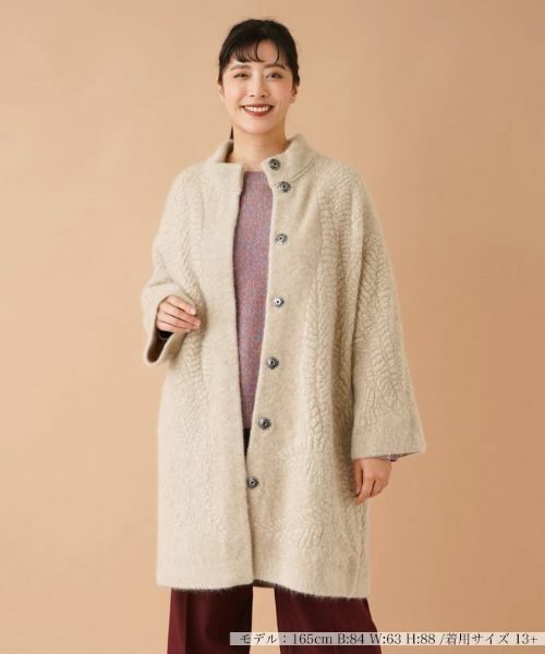 レリーフを思わせる繊細なボタニカル調の編み柄が浮かぶ、スタンドカラーのニットジャケット。ドロップショルダーで肩ラインを落としつつ、ヒップまですっぽりと包み込んでくれる、ロング丈のコクーンシルエットでデザインしています。フロントはスナップボタン仕様でスムーズに開閉が可能。前ウエスト左右にはスリットポケットをバランスよくレイアウトしています。温かみのある色合いでカジュアルにもオフィシャルにも使いやすいアウターです。