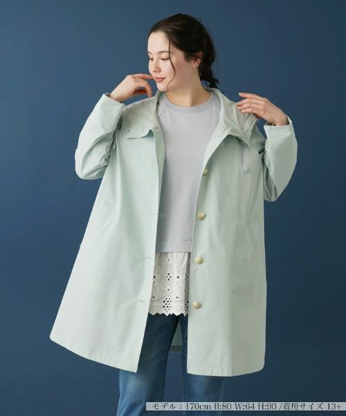 適度なストレッチ性があり、軽く爽やかな風合いの生地で仕立てた、フード付きのミディアム丈コート。季節の変わり目に身体を優しく包みこんでくれる一着です。袖はラグランスリーブで身体の動きを妨げず、リラックス感のある着心地をサポート。首元を美しく見せる高めのネックラインと、フロントの目を惹く大きめのマーブルボタンは、機能的でありながらもスタイリッシュなアクセントを加えています。日常の快適さとファッション性を両立させた理想的なアウターです。