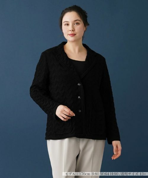 凹凸感のある編み込みがひと味違った表情を生み出すニットジャケット。緻密に編まれたコットンニットの質感が視線を惹きつける一着となっています。シルエットはすっきりとした印象に仕上がり、プレーンなインナーやボトムスともバランスよくコーディネートできます。ボタンにはラインストーンをあしらい、ほんのりと優美なエッセンスをプラス。きれいめなデザインでありながら、日々の装いに自然と溶け込むようなアイテムです。