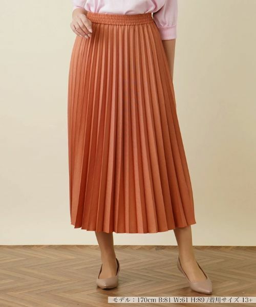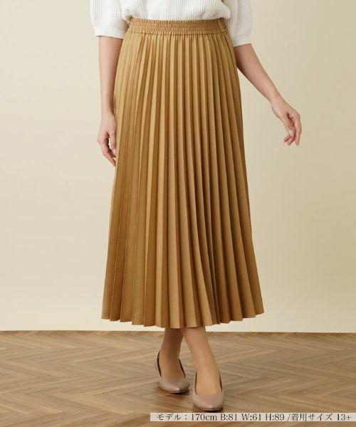 アコーディオンプリーツがエレガントな大人のスタイルを引き立てるマキシスカート。柔らかな光沢が纏った素材が洗練された印象を深めます。プリーツの繊細さも相俟って縦ラインを強調し、美しいAラインシルエットを描き出します。動くたびにふわりと波打つヘムがナチュラルな躍動感を演出。ウエスト部分はゴム仕様で柔軟性に富み、快適な穿き心地を提供します。使い勝手がよくデイリーコーデにもさりげなくマッチする一枚です。