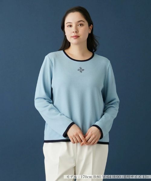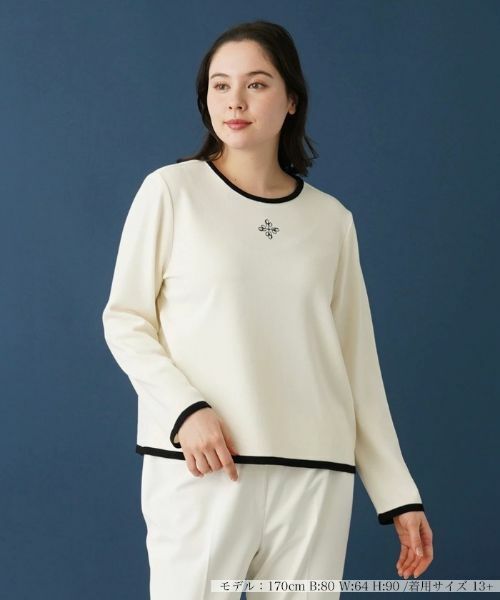 アウトラインのトリミングによりコントラストを効かせた、バイカラーデザインのクルーネックニット。フロント中央にさりげなくマークしたモチーフがワンポイントになっています。上品なカラーリングで取り入れやすく、軽やかな着心地が感じられるので、これからの季節のデイリースタイルにぴったりです。