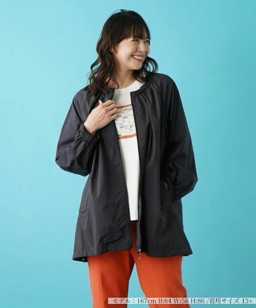 超軽量ナイロンタフタのライトコート。ナチュラルなシワ感と艶が特長の素材です。軽さを生かしてギャザーを入れたふんわりシルエットにしています。ポケッタブルのポーチ付なので小さくまとめて持ち運びに便利です。