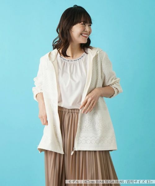 特殊な機械で織り上げた、オリジナルのラッセルレース素材を使用したジャケットです。幾何柄やフラワーモチーフなど、様々な柄が入っています。フード付きデザインで、カジュアルな印象ですが、繊細な柄の雰囲気がきれいめで目を惹くアイテムです。インナーが透けないように裏側にも生地を使用しています。