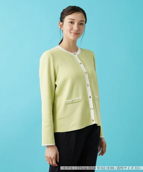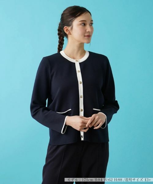 コントラストの効いたバイカラーデザインが視線を惹きつけるニットカーディガン。輝きを放つメタルボタンがアクセントに。前ウエスト両サイドには飾りポケットをレイアウトしました。単品での着用はもちろん、ボウタイブラウスと組み合わせることで、洗練された大人フェミニンなスタイリングが楽しめます。ワードローブに追加するだけでコーディネートの幅が広がり、これからの季節の様々なシーンでフレキシブルに活躍してくれそうなアイテムです。
