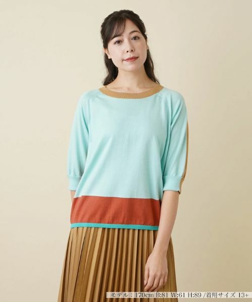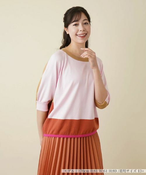 これからの季節らしいトレンドを反映したカラーブロッキングデザインの五分袖ニットプルオーバー。ハイゲージニットの滑らかな質感が美しく、さらりとした着心地で一枚でのスタイリングを楽しみたくなるアイテムです。明るめの色と落ち着いた色のカラーコンビネーションが絶妙なバランスのアクセントに。ワイドパンツなどのボリューム感のあるボトムスを組み合わせることで、リラックス感がありながらも洗練された印象のスタイリングが完成します。