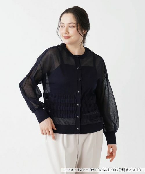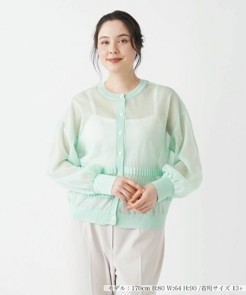 やや薄手のシアー素材で編み上げられたクルーネックニットカーディガン。季節らしい軽やかな風合いで、カジュアルな中にも女性らしいエレガンスを漂わせる一枚です。ウエスト周りにはボーダー状の編地を取り入れ、ユニークなアクセントをプラス。袖はボリュームスリーブでゆとりをもたせ、肩肘張らないストレスフリーの着心地を叶えました。シンプルなカットソーやワンピースの上からさらりと羽織るだけで、着こなしがぐっと華やぎ、たちまち旬のニュアンスに。
