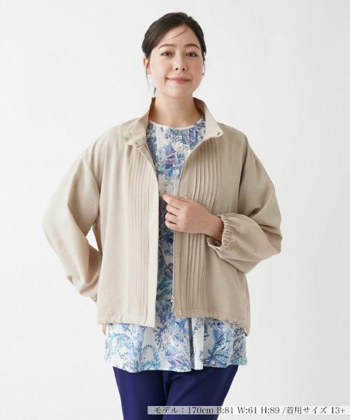 高めに設定したスタンドカラーが顔周りをモダンに引き締めるジップアップブルゾン。ドロップショルダーで落ち感をもたせ、リラクシーな着心地を叶えました。フロントに施したピンタックがエレガントな魅力を醸し出すアクセントに。裏地のないライトな着心地でちょっとした日除けや冷房対策にもおすすめのアウターです。比翼仕立ての前立てはスナップボタン×ファスナーにより開閉が可能。袖口にはゴムを入れて心地よいフィット感をもたせており、裾はドローコードで調整が行えます。