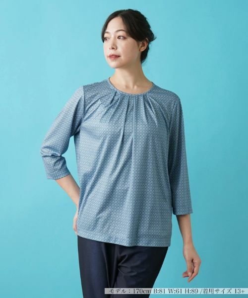 さりげなくセンスを感じさせる、細やかなレトロテイストの幾何学柄でデザインしたカットソー。すっきりと開いたネックラインや軽快な七分袖が、季節らしい絶妙なバランスの抜け感を演出。フロントにはタック&ギャザーを施し、女性らしい柔らかなニュアンスを醸し出しています。単品での着用はもちろん、ジャケットやカーディガンとのレイヤードスタイルのアクセントとしても重宝しそうです。バックネックの涙あきはループボタンにより開閉が可能。