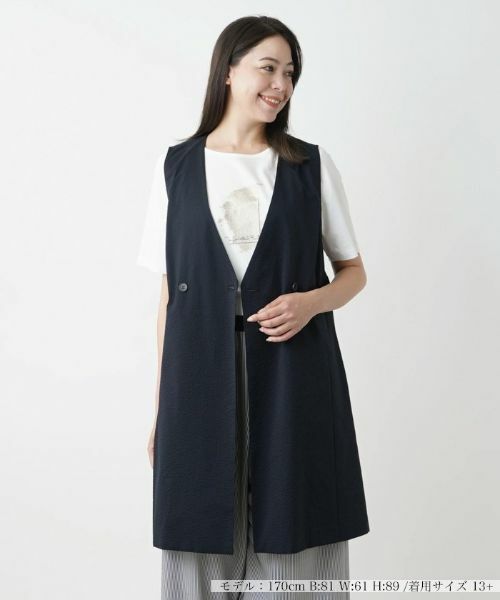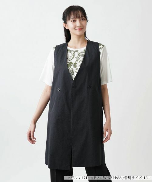 凹凸感のあるさらりとした風合いの生地で仕立てられた、ダブルブレステッド仕様のロングベスト。すっきりと開いた深めのVネックが開放的なムードを演出。裾にはサイドスリットを入れ、絶妙なバランスの抜け感を作り出しています。左右のウエストにはシンプルなスリットポケットをレイアウト。お手持ちのカットソーやニットに重ねるだけで、上級者らしい技ありのレイヤードスタイルが完成するアイテムです。