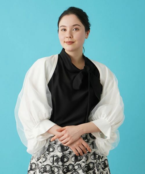 ふんわりとしたボリュームのあるドルマンシルエットが印象的。さらりと羽織るだけでモダンレディなレイヤードが楽しめるボレロカーディガンは、シアーなチュールを重ねることでドレッシーな華やぎも抜かりなく。