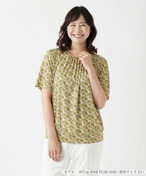 エキゾチックなボタニカル柄のプリントが個性を引き立てるカットソー。ネック周りにギャザーをたっぷりと施し、女性らしい柔らかなニュアンスに。とろみのあるやや薄手のストレッチ素材が体に優しく寄り添ってくれるから着心地も良好。スタンダードな丈感でボトムスともコーディネートしやすく、着回し力に優れたアイテムです。定番のパンツはもちろん、フェミニンなスカートを合わせた華やかな着こなしもサマになります。バックネックの涙あきはボタン開閉が可能。