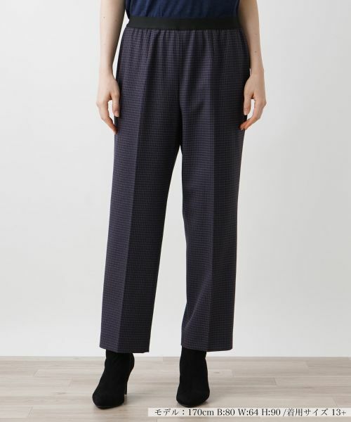細やかなチェック柄がお洒落な雰囲気を漂わせる、センタープレスが入ったストレートパンツ。クラシカルなデザインに、現代的なリラックス感を加えた絶妙な一本です。股上を深めに設定し、程よいリラックス感をもたせつつ、レッグラインは太すぎず細すぎずのシルエットで仕立てられており、快適なはき心地を実現。ウエストはゴム仕様でフィット感がありながらも、締め付け感を感じさせず快適性をキープ。タックインで着こなせば、脚長効果が期待でき、スタイルアップ見せにも貢献します。