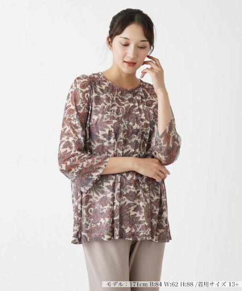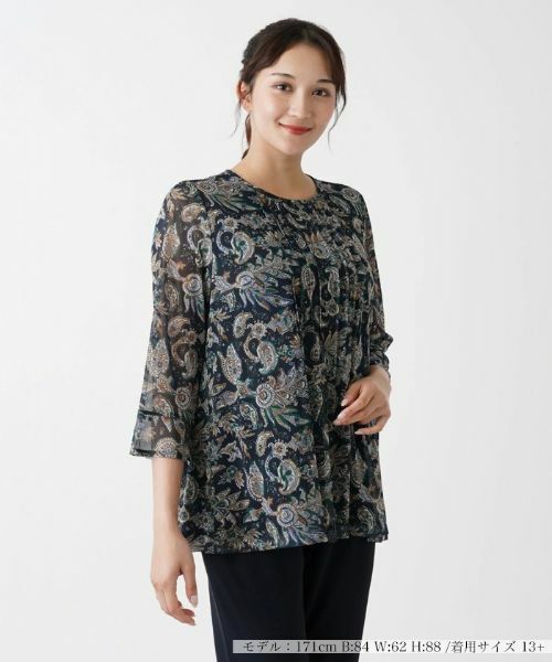 コーディネートに華やかさをプラスする、オリエンタル調のペイズリー柄をプリントしたブラウス。センスの良い色合いと繊細なプリントが、コーディネートをリッチにシフト。通気性と程よい伸縮性のあるパワーネット素材を使用しています。フロントにはピンタックが施されており、動きのあるシルエットを演出。スリーブにはほのかな透け感があり、シーズンらしい軽やかさを加えています。上品さとエレガントさを兼ね備えた一枚は、シンプルなボトムスと合わせるだけで、大人の女性らしい洗練されたスタイリングが完成します。バックネックの涙あきはループボタンにより開閉が可能。