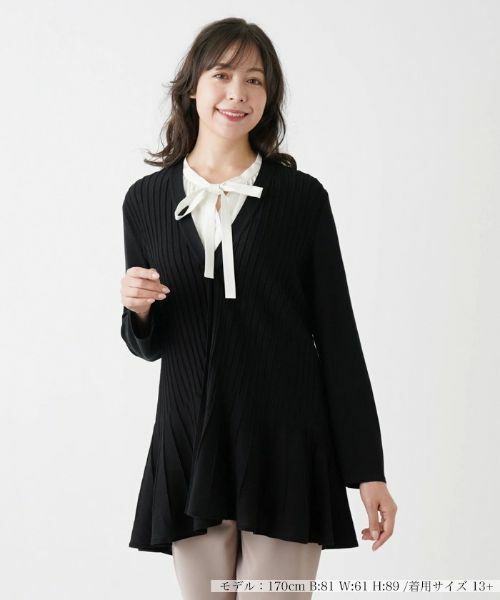 身頃と裾部分でリブの幅を変化させ、メリハリの効いたデザインに仕上げたカーディガン。コットンブレンドの薄手ニットの軽やかな風合いが特徴で、さっと羽織るだけでスタイリッシュに決まる一枚です。ウエストから下は美しいフレアシルエットになっており、軽やかなフェミニンムードを演出。ヒップまでしっかりとカバーするレングスなので、気になる体型を自然にカバーしつつ、エレガントな大人のスタイルを楽しめます。