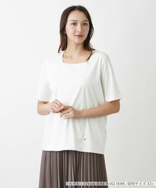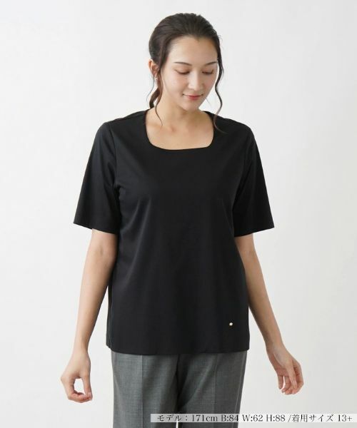 肌に優しく、やや薄手のコットン生地で仕立てたシンプルなカットソー。いちばんの魅力は、従来のTシャツとは一線を画すスクエア形状のネックライン。程よい抜け感を演出し、ヘルシーなデコルテ見せをアシスト。インナーとしてはもちろん、一枚でさらりと着た際にも洗練されたデザインが光ります。ジーンズやスカートとの相性も抜群で、カジュアルから少しドレッシーなコーディネートまで、幅広いスタイリングに対応できる便利なトップスです。------------------------------------着用シーズン:秋伸縮性:あり透け感:なしポケット:なし生地の厚さ:やや薄手お取扱い方法:ウォッシャブル(手洗い可)-------------------------------------※商品の色味は、撮影場所や光のあたり具合、お客様のお使いの機器により色味が違って見える場合がございます。予めご了承ください。手洗い可漂白不可タンブル乾燥不可つり干し(日陰)アイロン低温210℃まで石油系溶剤ドライクリーニング弱ウェットクリーニング(弱い処理)