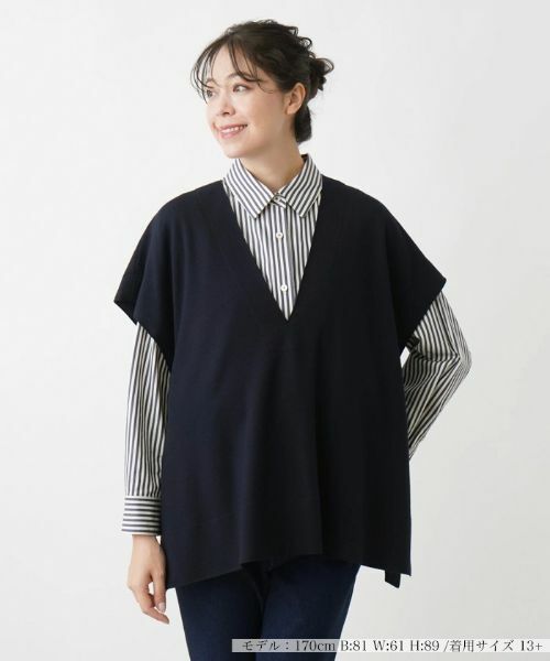 Vネックのプルオーバータイプのジレ。ゆったりとしたリラックスシルエットと、サイドのベルト&Dカンがデザインポイントです。厳選された※「Super100'sウール」を使用した高級感のある圧縮ジャージー素材です。