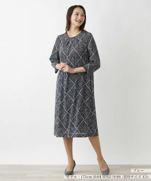 グラフィカルな格子柄のプリントを落とし込んだ、クロップドスリーブのサックワンピース。適度に開きをもたせたネックラインが絶妙なバランスの抜け感を演出。シルエットには自然なドレープ感があり、柔らかなニュアンスに。やや薄手のパワーネット素材を使用しているので、程よい伸縮性を備えています。身体のラインを拾いにくく、体型カバーもお手のものです。バックネックの涙あきはループボタンにより開閉が可能。アンダースカート付き。