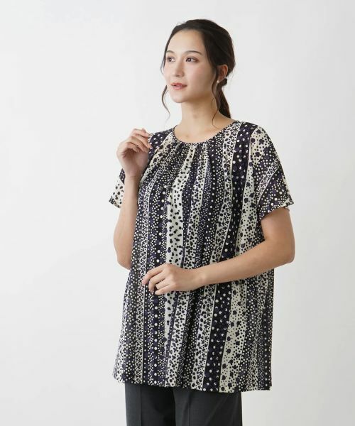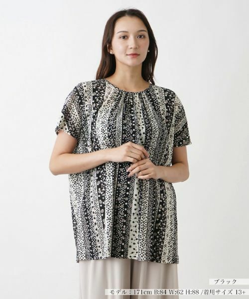 グラフィカルなドット×ストライプのプリントがインパクトを放つ、半袖丈のオーバーブラウス。ネックラインはすっきりと開き、絶妙なバランスの抜け感をプラス。ゆったりとしたシルエットで着こなしやすく、パワーネット素材を使用しているため、適度に伸縮性があり着心地も快適です。身体のラインを拾いにくく、ヒップまで自然に隠れる程度の丈感なので体型カバーもバッチリ。バックネックの涙あきはループボタンにより開閉が可能。