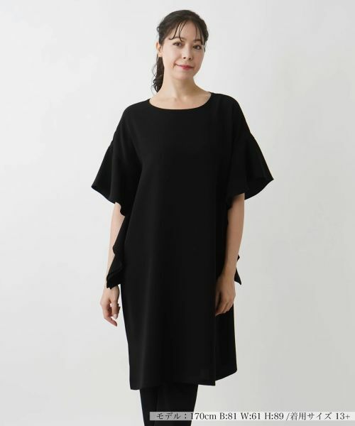 フレア感たっぷりのバタフライスリーブがフェミニンな華やかさを演出する、ロングブラウス。ゆったりとしたラウンドネックがヘルシーなデコルテ見せを叶えます。身体のラインを拾いにくく、ヒップまですっぽりと隠れるので体型カバーもお手のもの。落ち着いたシックな色合いで派手になりすぎることなく、コーディネートしやすいのも嬉しいポイント。裾にはサイドスリットを入れ、絶妙なバランスの抜け感を作り出しています。バックネックの涙あきはループボタンにより開閉が可能。