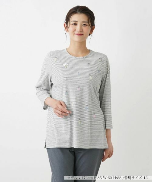 爽やかなナローボーダーを背景に、手描き風のモチーフを刺繍で表現した新鮮なデザインのカットソー。ビーズやリボンを取り入れ、細部まで手の込んだ仕上がりに。肌当たりのよいやや薄手の柔らかなコットン生地を使い、スマートなシルエットでデザインしました。すっきりとしたクルーネック、袖はクロップドスリーブで軽快な印象を作り出しています。パンツにもスカートにも合わせやすく、着回し力に優れたトップスです。