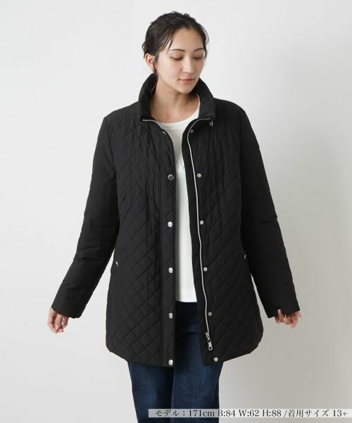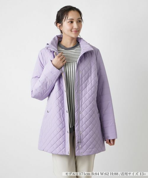 ボリュームを極力抑えた中わたキルティング加工で仕上げた、洗練された佇まいのスタンドカラーコート。襟周りはファスナー付きでフード収納可能なタイプとなっており、コーディネートやシーンに合わせてお好みでアレンジが楽しめます。フロントはスナップボタン?ファスナーのダブルクロージャー仕様でしっかりと閉じられるので安心。オフィス通勤から週末のおでかけまで多彩なシーンで活躍してくれそうな使い勝手のよいアウターです。