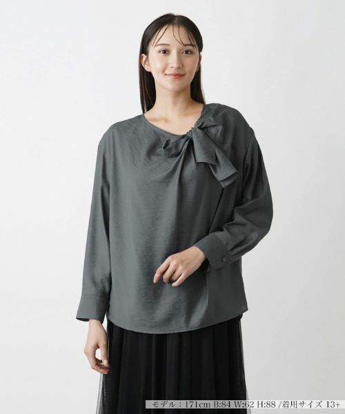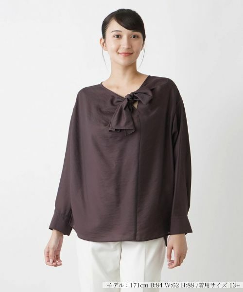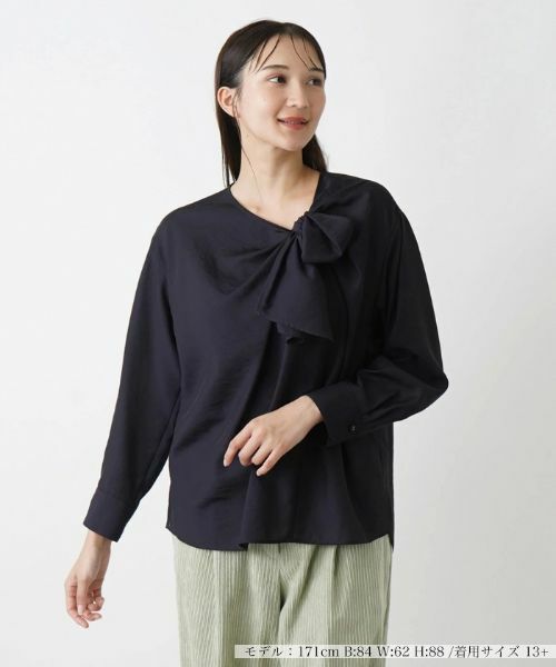 フロント左ネックにあしらった大ぶりのリボンがスイートな華やかさを引き立てるブラウス。ネックラインは適度に開きをもたせており、デコルテをきれいに覗かせます。シルエットには程よくゆとりを作り、肩肘張らないリラクシーな着心地を叶えました。裾にはサイドスリットを入れ、絶妙なバランスの抜け感をプラス。スカートでまとめたフェミニンルックはもちろん、パンツを合わせた定番のスタイルもおすすめです。バックネックの涙あきはボタン開閉が可能。リボンは取り外し不可。