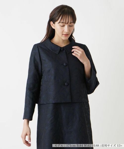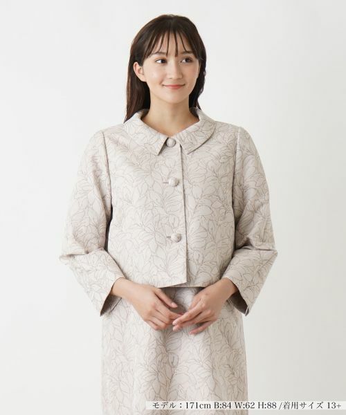 ライトベージュを基調とした上品な色合いで、全体に繊細なリーフ柄が施されているクロップドジャケットです。