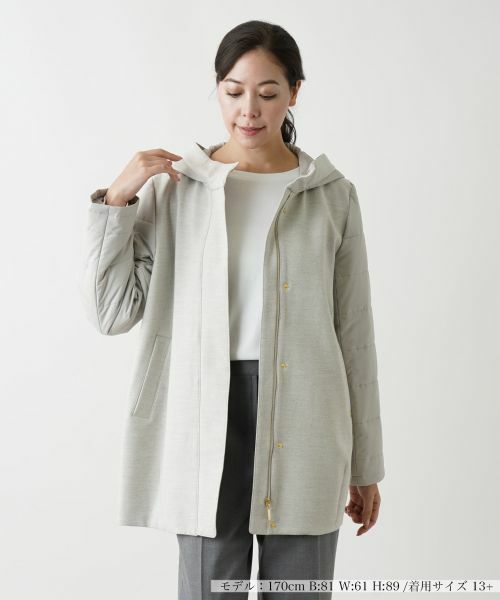 存在感抜群のビッグフードが印象的なフーデッドジャケット。上品な風合いのやや厚手の生地を使用し、保温性とスタイリッシュな雰囲気を両立しています。袖や後ろ身頃は中わたキルティングで切り替え、異素材の組み合わせがさりげなく視覚的なアクセントを加え、立体感のあるデザインに。フロントは比翼仕立てで、ファスナーとスナップボタンの二重仕様で防風性も高めました。タウンユースはもちろん、アウトドアシーンでも頼れるアウターとして活躍します。