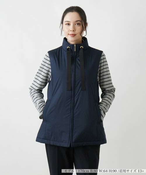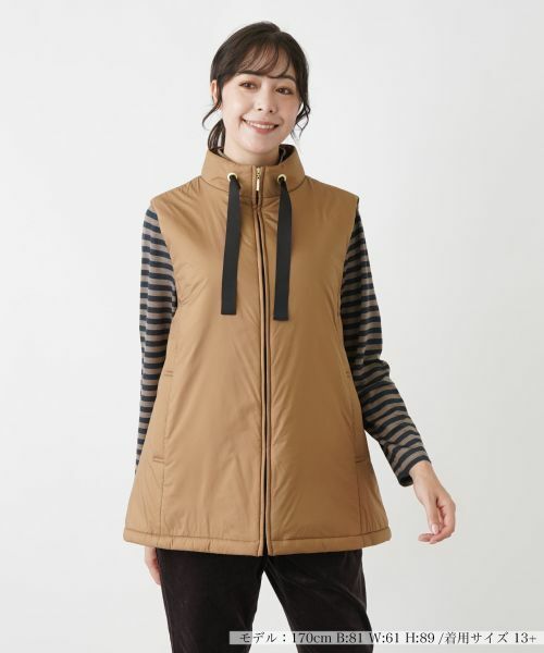 キャメルの中わたを使用した、とても軽く暖かいデザインジレ。LIMONTA(リモンタ)社のタフタ素材を使用しています。インナーベストとしても着用可能。ブラックのファスナーとグログランテープが引き締めた印象のお洒落なベストです。