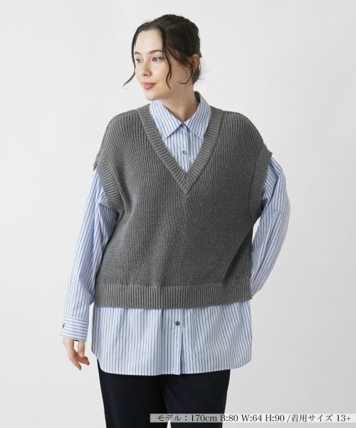 シャツにベストを着ている風のチュニックブラウスです。トレンドアイテムの重ね着が一枚で完成します。