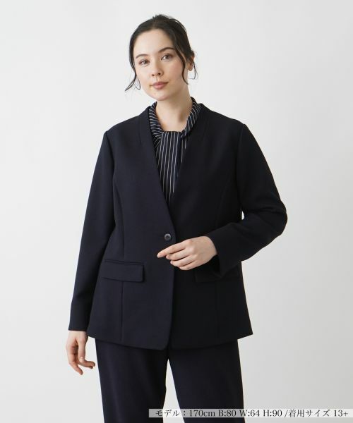 深めのVネックが洗練された印象を与えるノーカラージャケット。フロントはワンボタンのシンプルなデザインで、流行に左右されず長く愛用できます。女性らしいシルエットを作る少しシェイプしたウエストラインと程よいコンパクトな丈感は、パンツだけでなくスカートやワンピースとも相性抜群。ボウタイブラウスやハイネックトップスと合わせれば、顔周りが一層華やかに引き立ちます。オフィスからセレモニーまで、幅広いシーンで活躍するアイテムです。