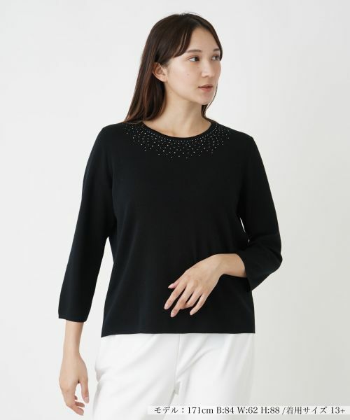 ネック周りに夜空の星々のように煌めくラインストーンを散りばめた、華やかな印象のニットプルオーバー。すっきりとしたシルエットで、様々なインナーやボトムスと合わせやすく、デイリースタイルに気軽に取り入れられます。ベーシックな定番のパンツでシンプルにまとめるのはもちろん、フェミニンなスカートと合わせることで上品な華やかさが引き立ち、多彩なシーンで活躍してくれそうな一枚です。