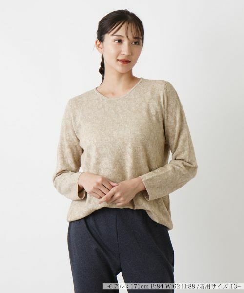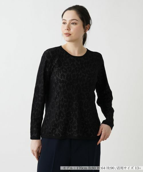 シャドーで表現された、大ぶりのレオパード柄がさりげなく個性を引き立てるカットソー。ラメの煌めきを散りばめ、ラグジュアリーな雰囲気を醸し出しています。ネックラインは適度に開きをもたせ、絶妙なバランスの抜け感を演出。遠目からは無地にも見え、すっきりとしたシルエットでコーディネートしやすく、一枚での着こなしはもちろん、ジャケットやコートなどのアウターとの重ね着でも重宝しそうです。