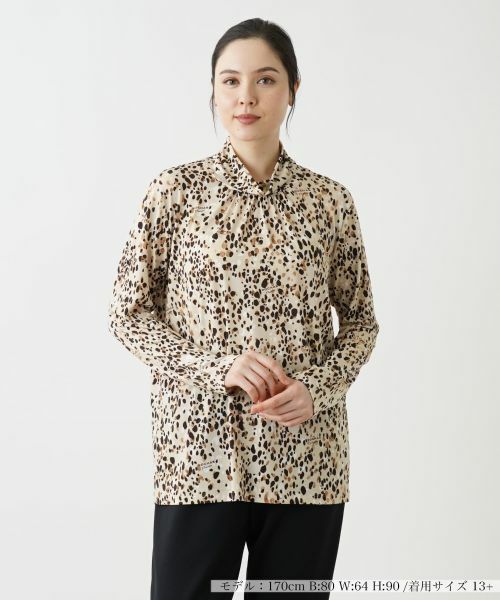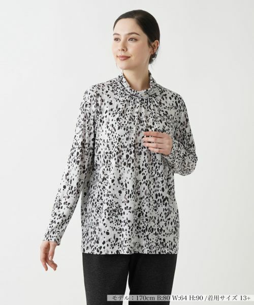 アーティスティックな柄とブランドロゴをさりげなく散りばめたハイネックカットソー。ネック周りにドレープ感を生み出し、柔らかなニュアンスを醸し出しています。すっきりとしたシルエットで着こなしやすく、これからの季節のコーディネートの主役として活躍してくれそうなアイテムです。ベーシックな定番のパンツルックはもちろん、エレガントなロングスカートでまとめた大人フェミニンなスタイルとも好相性。