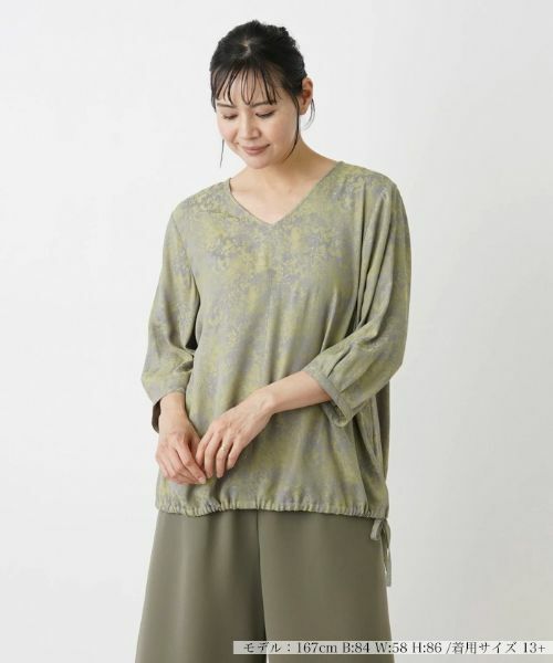 うっすらと繊細なボタニカル柄が浮かぶ、手の込んだエレガントなデザインのVネックブラウス。統一感のある色使いでまとめているため、遠目からだとシンプルに見え、さまざまなコーディネートに取り入れやすくなっています。すっきりと形よく開いたネックラインがヘルシーなデコルテ見せを叶え、クロップドスリーブで軽やかなシルエットを演出。裾はドローストリングにより絞りを入れて調整が行え、バック中央はファスナーにより開閉が可能です。