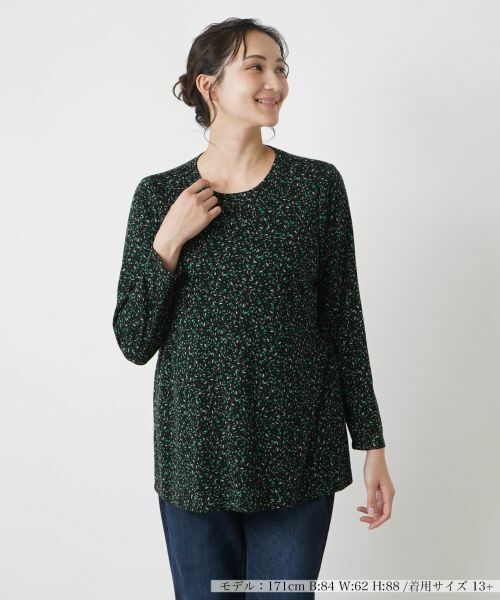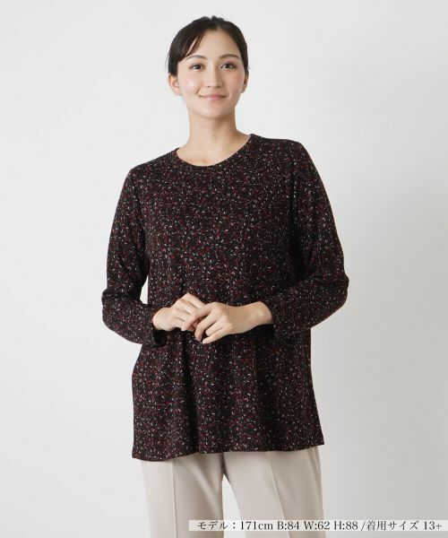 季節感溢れるボタニカル柄が彩るカットソー。鮮やかなプリントがコーディネートに華やかさを添え、シーズンムードを演出。裾周りはふわりと広がるフレアシルエットで、優雅さと軽やかさを兼ね備えたデザインに。身体のラインを拾いにくく、リラックス感がありながらもスタイルを美しく見せてくれます。細身のパンツやスカートと合わせることで、バランスの取れた上品なコーディネートが完成します。