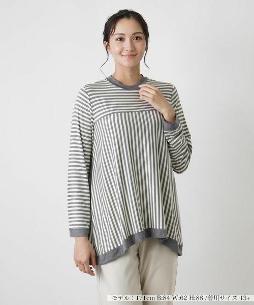 縦横に切り替えられたストライプが特徴となった、技ありのチュニック丈プルオーバー。ユニークな柄使いがシンプルな中にも個性を引き出し、視線を集める一枚です。首元は浅めのネックラインが上品な印象をプラス。ゆったりとしたシルエットで、身体のラインを拾いにくく、ナチュラルに体型カバーしてくれるのも嬉しいポイントです。ヒップまで隠れる絶妙な丈感が、コーディネートに程よいバランスを与え、カジュアルからきれいめまで幅広く対応するトップスです。