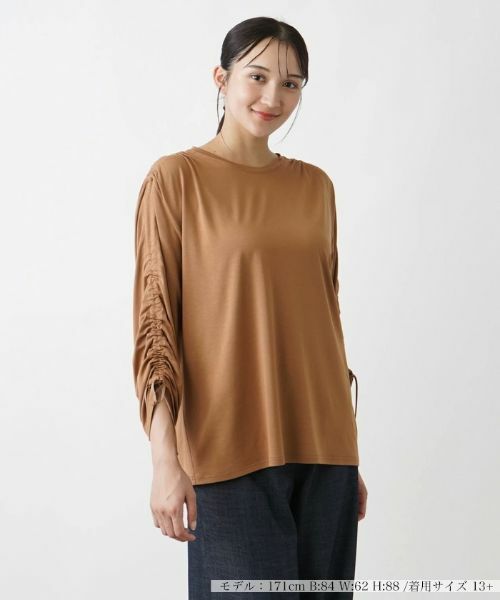 ショルダー部分のギャザーや、シャーリングスリーブがインパクトを放つカットソー。ネックラインを浅めに設定しており、身頃はすっきりとしたシルエットで着こなしやすく、ボトムスを選ばずにフレキシブルにコーディネートできる一枚です。統一感のある上品なワントーンカラーも嬉しいポイント。やや薄手の柔らかなレーヨンベースのファブリックを使用し、ストレッチ素材を混紡しているので着心地も快適。袖はドローコードにより調整が行えます。