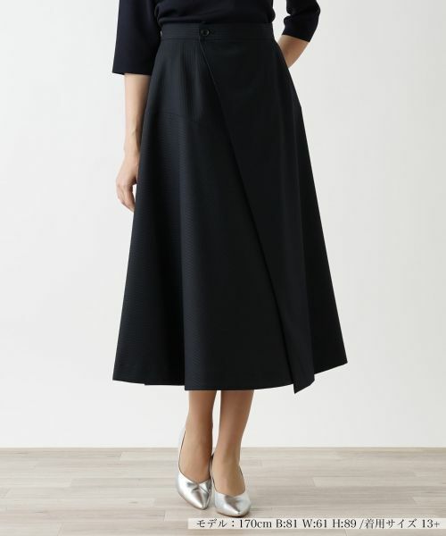 細やかなストライプ生地を使用したロング丈のラップスカート。フロントで生地を合わせるデザインがさりげなくこなれ感を演出します。シルエットは程よくウエストシェイプしつつ、裾に向かって広がりをもたせ、大人の女性らしいエレガントな雰囲気に。バックウエストはゴム仕様で心地よくフィット。落ち着いたシックな色合いでトップスとも合わせやすく、タックインすれば脚長見せのスタイルアップ効果も狙えそうです。