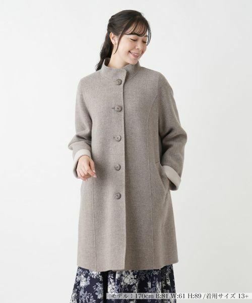 起毛感のある厚手の生地を贅沢に使用したスタンドカラーコート。巧妙に設計されたパターンメイクで生み出された広がりのあるシルエットで、シンプルながらも上品な佇まいが際立ちます。味わいのあるマーブルボタンがアクセントとなり、細部へのこだわりを感じさせる一着。前ウエストの左右にはスリットポケットをレイアウトしました。袖口を折り返すことで異なる印象のスタイリングを楽しめ、これからの季節の幅広いシーンで活躍するアイテムです。