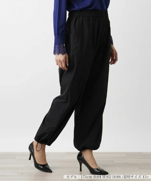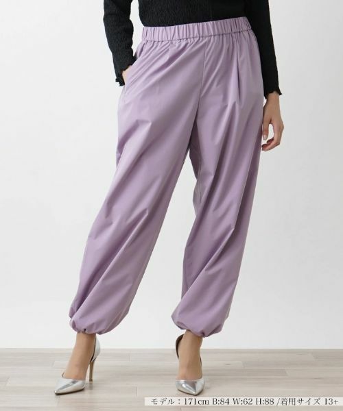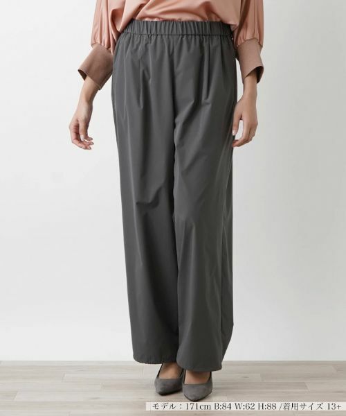 やや薄手のさらりとした風合いのファブリックを使用したワイドパンツ。ギャザー+タックを施し、すとんと落ちるようなリラックス感溢れるシルエットでストレスフリーのはき心地を叶えました。ウエスト周りは総ゴム仕様で心地よいフィット感をもたせています。ミニマルな無地のデザインでトップスとも合わせやすく、タックインすれば脚長見せのスタイルアップ効果も狙えそうです。裾はドローコードにより調整が可能。