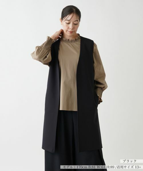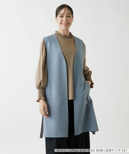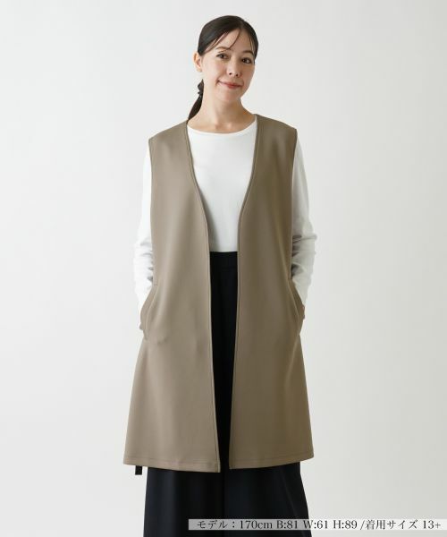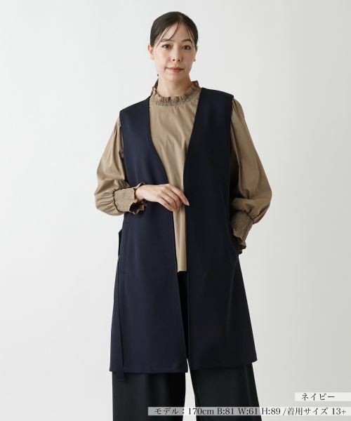 落ち着いたカラーリングとすっきりとしたVネックラインが、エレガントな雰囲気を演出してくれるジレ。フロントはボタンレスで、シンプルでありながらも洗練されたデザインが魅力の一枚です。ウエスト部分にはベルトが付いており、シルエットを引き締める効果があるため、スタイルアップ見せも期待できます。サイドにはさりげなく飾りボタンをプラス。軽やかな生地感で、季節の変わり目のレイヤードスタイルにぴったりです。合わせるインナーやボトムスを選ばず、お手持ちのアイテムの上にさらりと羽織ることでトレンド感のあるスタイリングにアップデートされます。