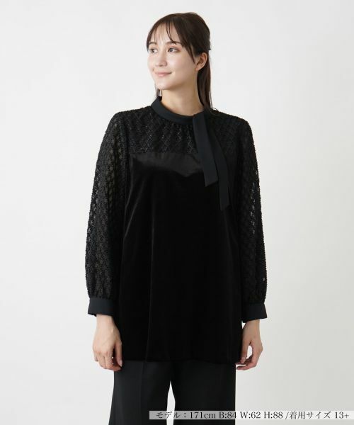 ユニークな素材でダイヤモンド模様が美しく表現された生地と、シンプルな無地を巧みに切り替えたボウタイブラウス。柔らかくふんわりとしたスリーブラインが、女性らしい優雅なムードを引き立てます。シックで統一感のある色使いで様々なボトムスと合わせやすく、スタイリングの幅が広がります。ヒップまでを自然にカバーする絶妙な丈感なので、スタイルアップ効果も期待できそうです。