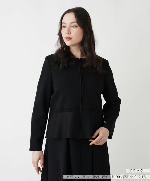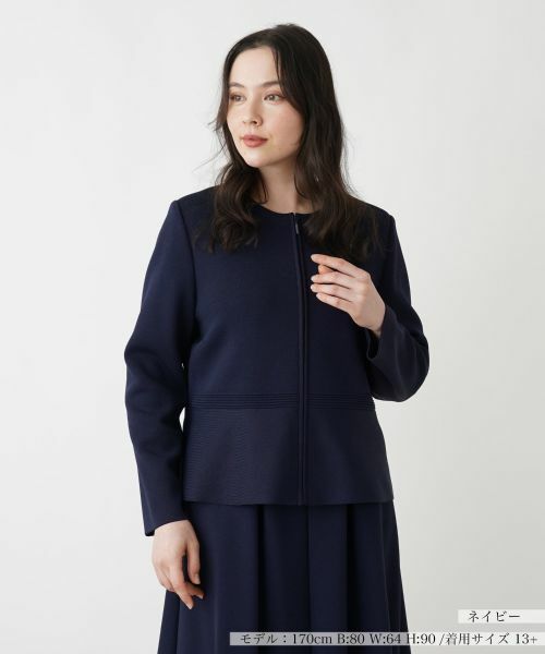 ウエスト周りに施されたペプラムが、フェミニンで華やかなアクセントを添えるノーカラージャケット。洗練されたシルエットが全体をすっきりと見せ、多彩なコーディネートに合わせやすいのが魅力。フロントはファスナー仕様になっており、スムーズな着脱を実現します。シンプルながらも女性らしさを忘れないデザインは、オフィスシーンからカジュアルな日常までオンオフ問わず活躍します。