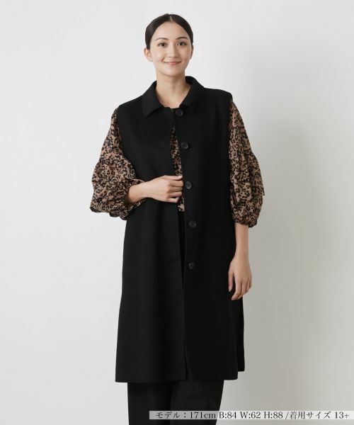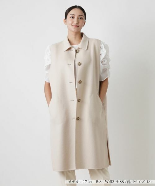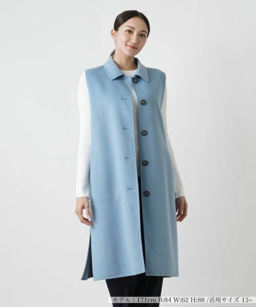 洗練されたシンプルなデザインで、さまざまなスタイルに取り入れやすいロングベスト。毛ブレンドの上質な生地感で、軽やかさと保温性を兼ね備えています。フロントにはクラシックなボタンが並び、さりげないアクセントをプラス。ストレートなシルエットはスタイルをすっきりと見せ、縦長ラインを強調してくれます。裾サイドにはスリットを入れ、抜け感をプラス。インナーにタートルネックやシャツ、ニットなど様々なアイテムと合わせやすくカジュアルからフェミニンまで幅広いコーディネートが可能です。いつものスタイリングにプラスするだけでトレンド感のある着こなしが楽しめます。